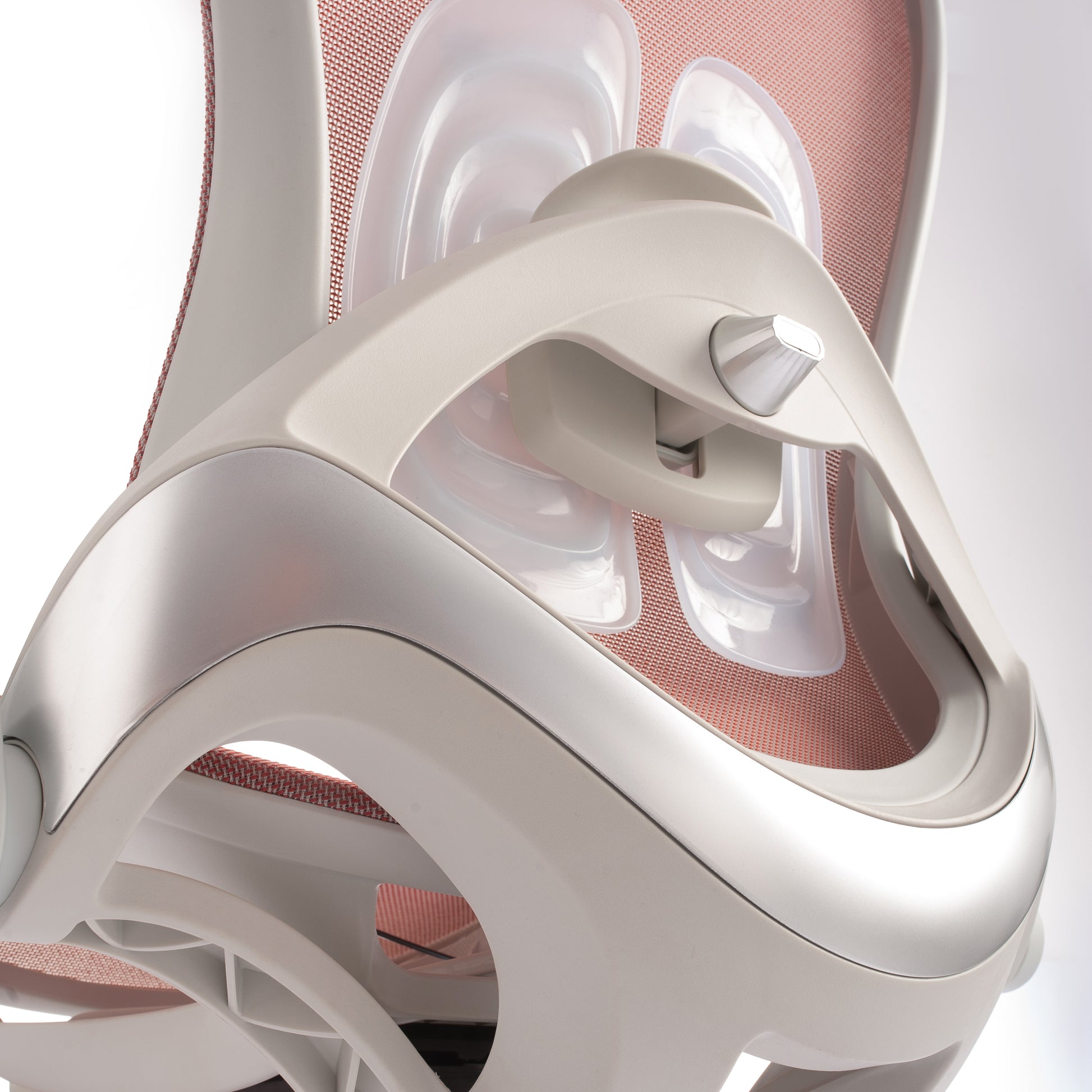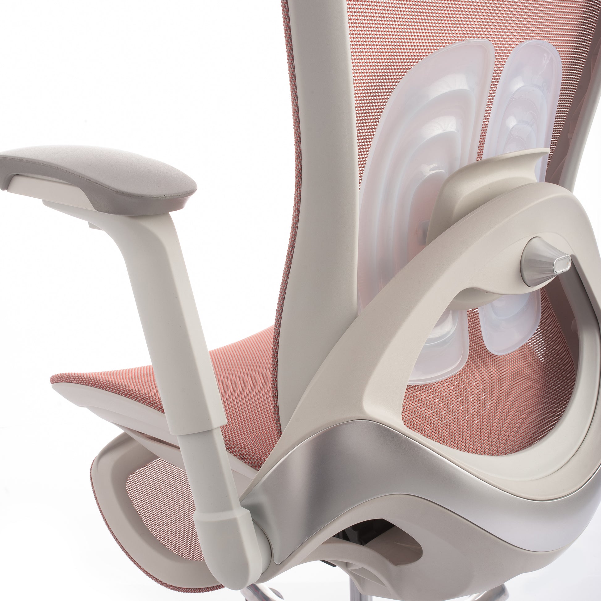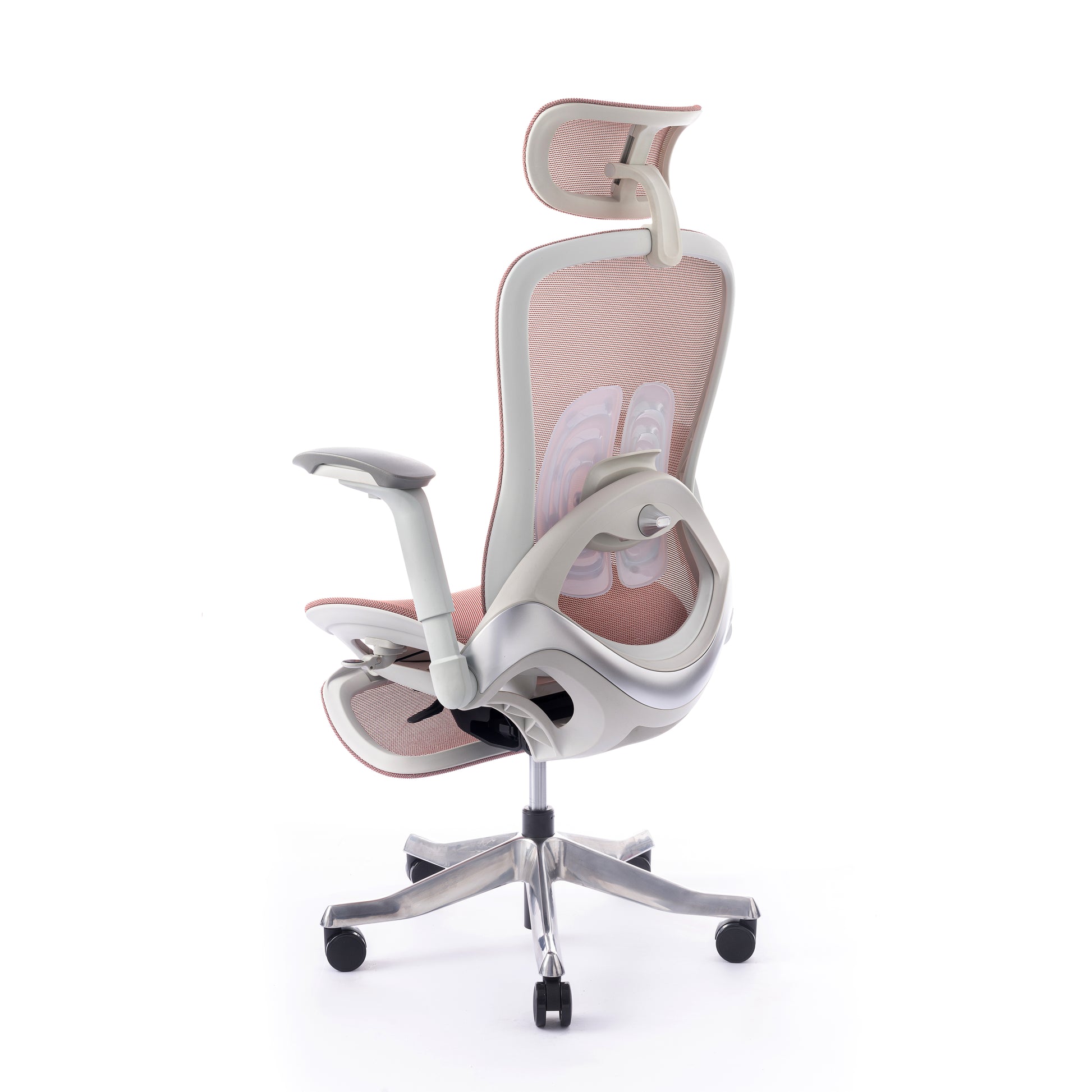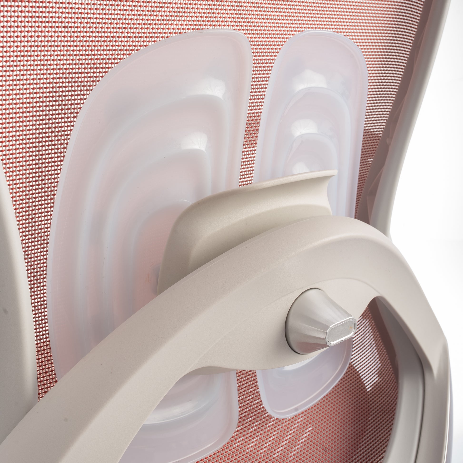 Mbështetës shpine: Kombinim PP + PA + ABS me rrjetë najloni, kënd rënie midis 105° dhe 125°. Mbështetje lumbare TPE, e rregullueshme përpara-mbrapa dhe lart-poshtë.
